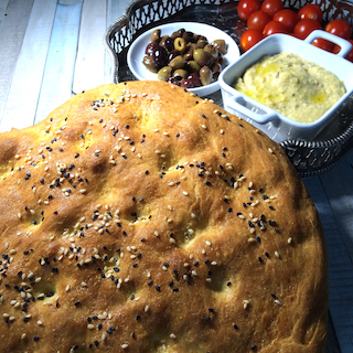 Den Teig auf einer bemehlten Arbeitsfläche nochmals durchkneten und zu einem runden Fladenbrot  formen. Auf ein mit Backpapier belegtes Backblech legen, abdecken und weitere 30 Minuten gehen lassen.